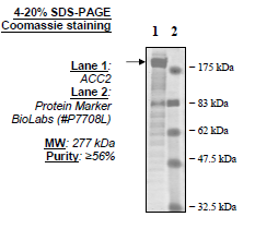 Human acetyl-Coenzyme A carboxylase alpha transcript variant 2 (ACC2), GenBank Accession No. NM_001093, full length, with N-terminal His-tag, MW=277 kDa, expressed in a Baculovirus infected Sf9 cell expression system. |